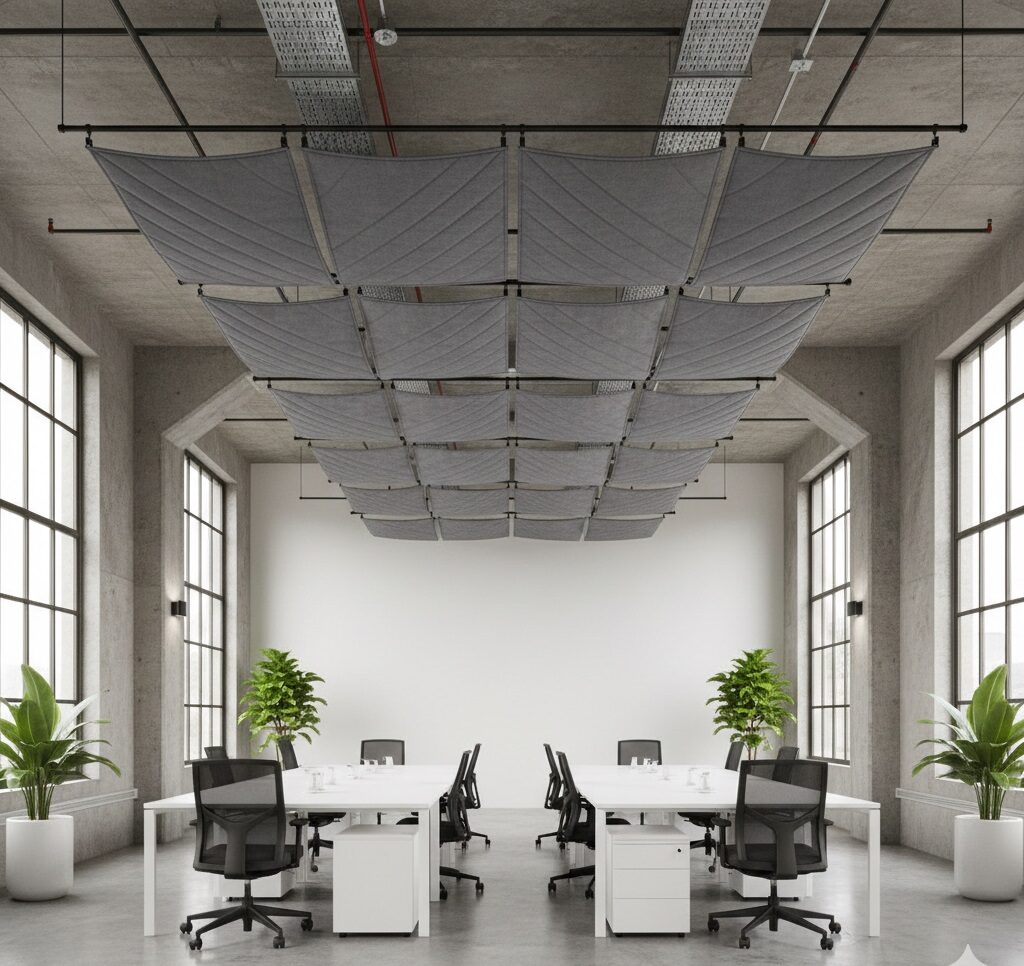 Panel textil acolchado suspendido para techo, pensado para mejorar el confort visual y acústico en espacios industriales contemporáneos. Su diseño limpio y técnico aporta calidez sin perder sobriedad, integrándose en oficinas abiertas, salas de reuniones y espacios creativos. Funciona como un elemento arquitectónico ligero y funcional.