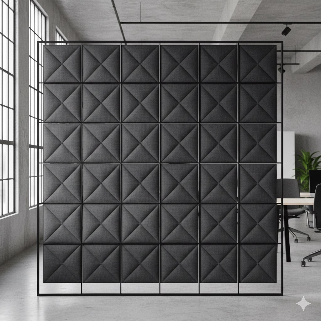 Separador textil acolchado de diseño contemporáneo con costuras diagonales continuas que aportan dinamismo visual sin sobrecargar el espacio. Diseñado para organizar ambientes abiertos manteniendo una sensación de amplitud, confort acústico y coherencia estética. Ideal para oficinas creativas, estudios, espacios corporativos y proyectos de interiorismo industrial donde se busca funcionalidad con carácter arquitectónico. Su acabado limpio y profesional lo convierte en una solución elegante y versátil para proyectos a medida.